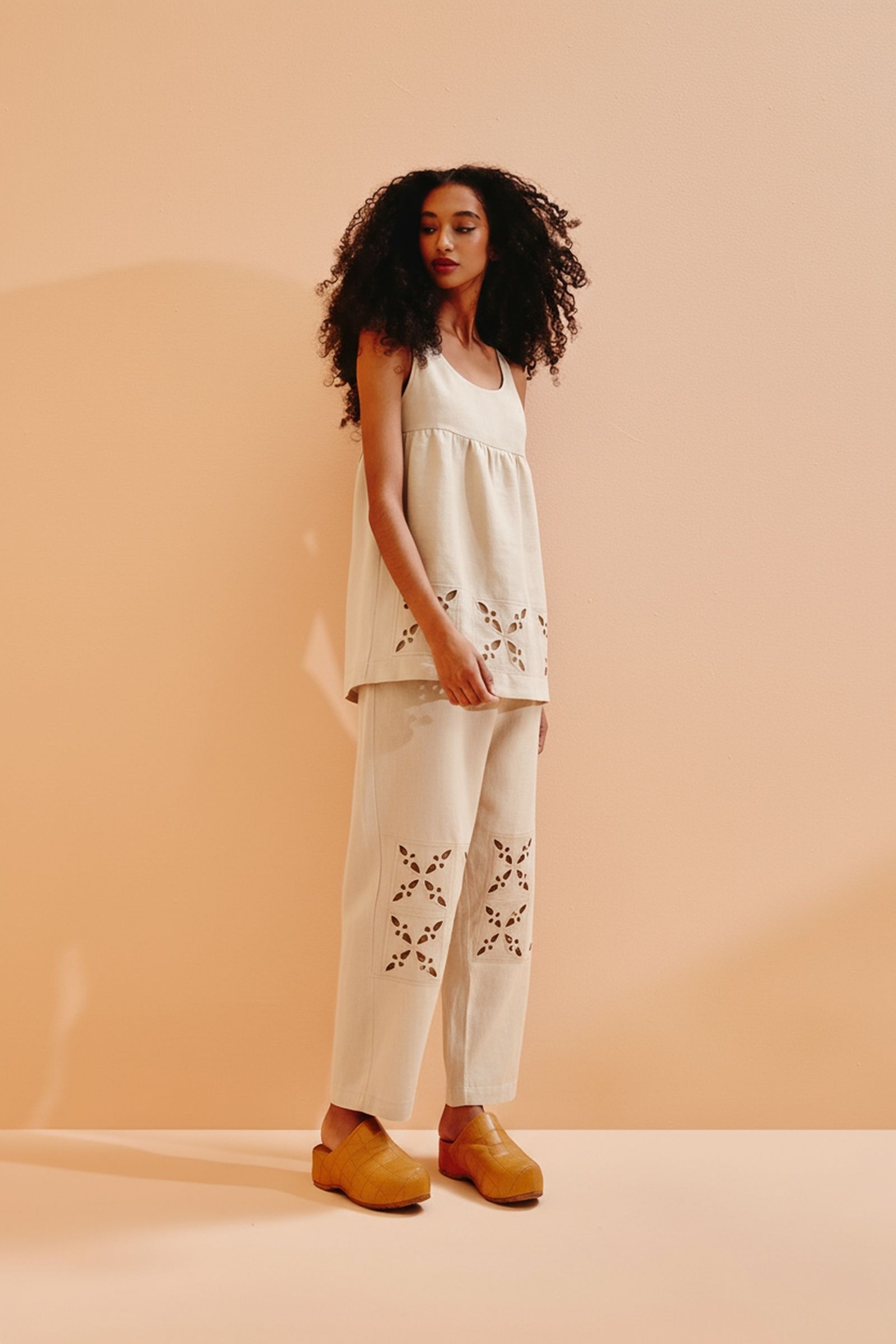 A Calça Celeste é confeccionada em linho leve com bordado exclusivo. A calça possui cintura alta, fechamento com zíper nas costas, barra afunilada e aplicação de bordados.