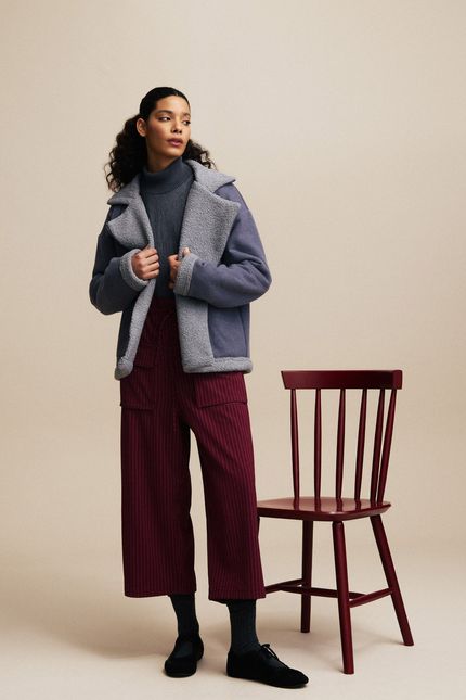 A Calça Humanista é confeccionada em veludo. A calça possui cintura alta, fechamento por zíper de metal nas costas e barra afunilada.