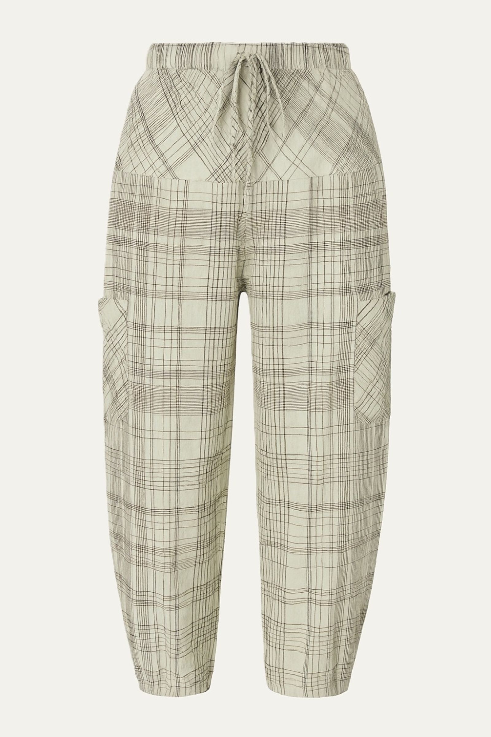A Calça Noctara é confeccionada em algodão leve com estampa xadrez. A calça possui cintura alta, elástico embutido com costura zigzag, aplicação de cadarço do próprio tecido e barra afunilada.